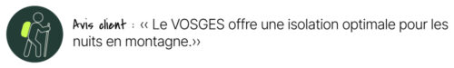 Le VOSGES offre une nuit confortable entre 0°C et 5°C, tout en résistant à des températures extrêmes allant jusqu’à -10°C. La présence d’un bourrelet et d’une collerette limite les déperditions de chaleur, ce qui renforce la protection lors des nuits les plus fraîches.